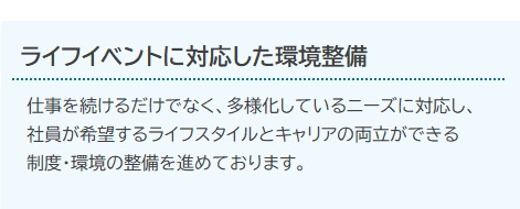 多様な能力や価値観を持つ人財が安心して働けて、社員が誇りに思える会社を実現するため、仕事と生活を両立しながら活躍できる選択肢の拡大等に取り組んでいます。
