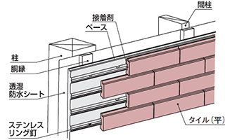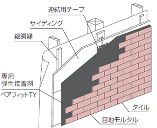 推奨サイディング(窯業系無塗装サイディング)を下地として施工し、熟練の職人により専用接着剤で直接タイルを貼り付ける工法です。