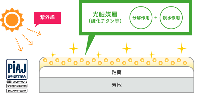 ※酸化チタン(光触媒層)に光(紫外線)が当たることで、「分解」、「親水」の作用を発生させる機能付きタイルです。