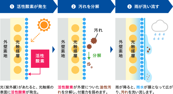 光触媒の分解作用により大気汚染物質「PM2.5」、「光化学スモッグ」や「酸性雨」など環境汚染の原因となるNOxを分解し付着力を弱め、親水作用を利用して雨の力で汚れを洗い流します。