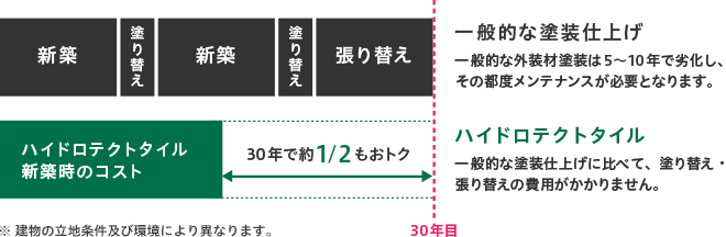 ハイドロテクトタイルは、一般的な塗装外壁に比べ、維持費用はほとんど不要。