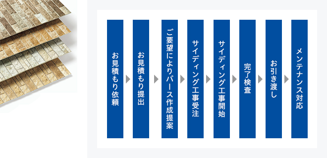 住まいの第一印象を決める外装は、単に美観上の役割だけでなく、雨、風、日光など様々な外的要因から住まいを守る大切な役割を担っています。私たちは、外装建材の選定、ご提案から施工までトータルにサポートいたします。